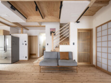 玄関の扉を開くと窓から太陽の光が差し込み阿蘇小国杉のいい香りが広がります。大きな吹抜けがダイナミックなリビング。杉の無垢床は足触りが良く、漆喰、珪藻土を使った塗壁により空気はスッキリとさわやか。木目が美しい勾配天井が開放的な空間を演出します。風通しや天然の光を考慮し、自然の力を最大限に活かせるように設計しています。職人が手掛けた数々の造り付け収納や洗面台、シンプルなつくりの中にこだわりをたくさん詰め込んだ家をぜひご覧ください。