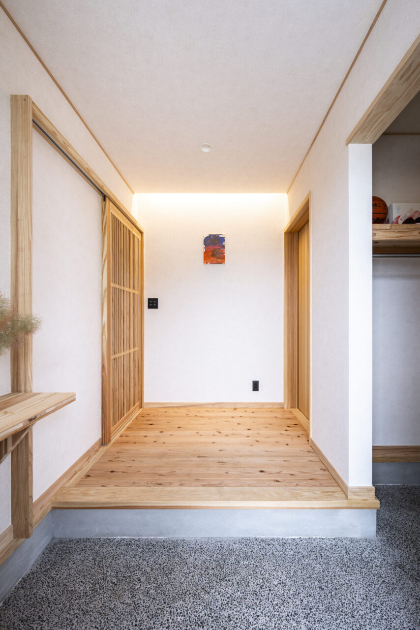 足元から趣を感じる洗い出しの玄関ポーチを開けた瞬間、ただよう木の良い香り。正面に息子さんが書いた絵画がシンボリックに迎えてくれる。内玄関から左手はリビング、右手はウォークスルークローゼットと洗面室、キッチンへとつながる回遊動線の快適な間取りがY邸の特徴。