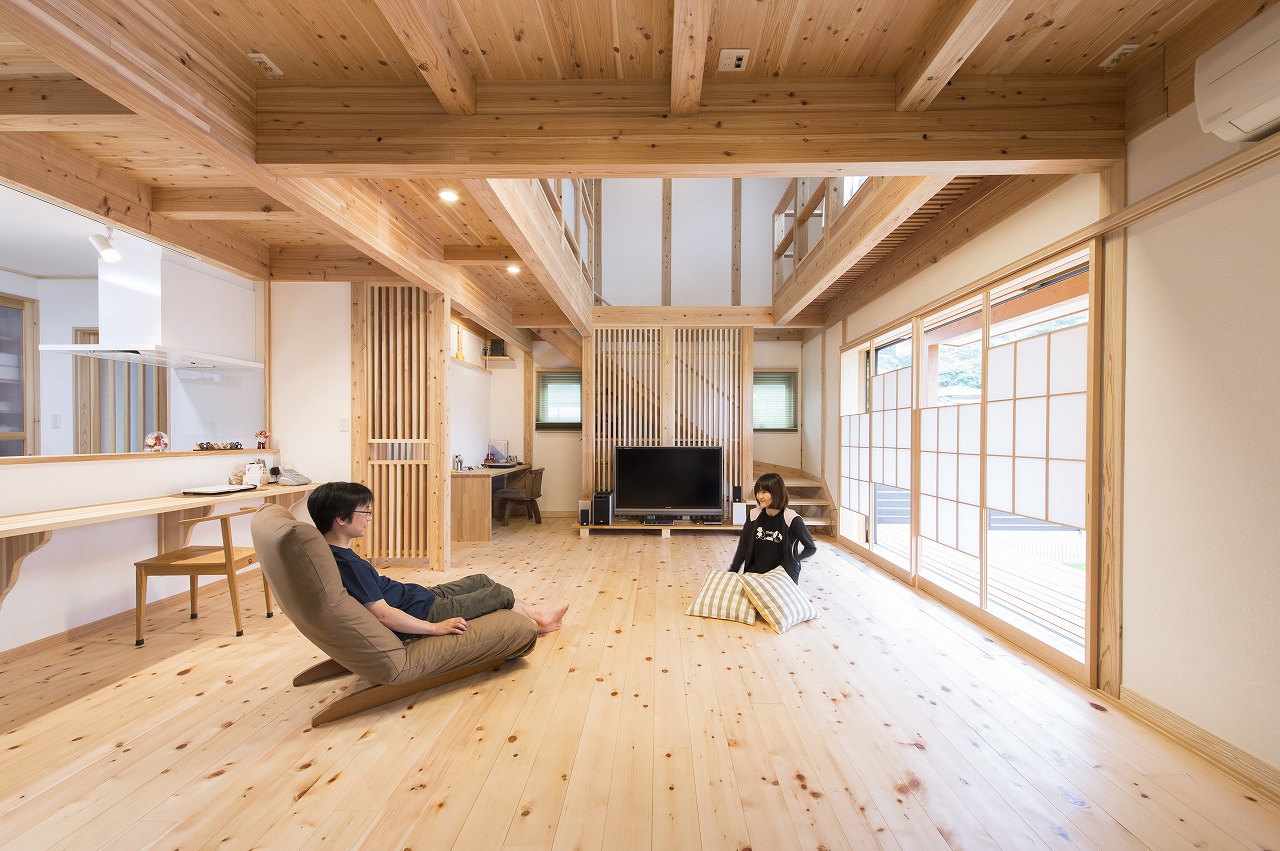 吹き抜けと木の素材感に和のデザインも美しく調和
