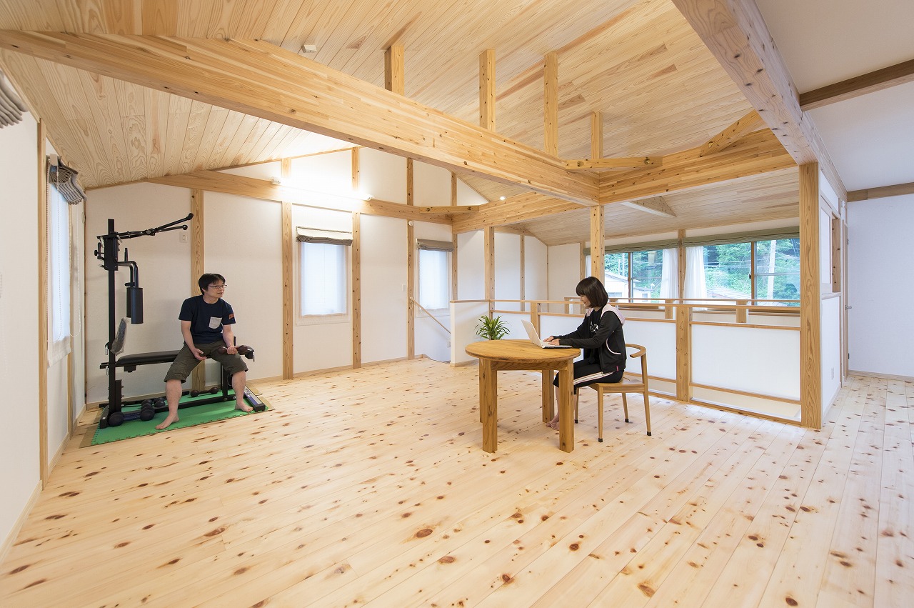 1階と同じく、2階も仕切りのない開放的な一間続きで使っているご夫妻。今はベッドスペースと、ご主人の筋トレマシーンが置かれている状態だが、いつかビリヤード台を置くことがご主人からのリクエスト。一方、奥さまはリビングにプロジェクターを設置して、映画を観たいと構想中なのだとか。