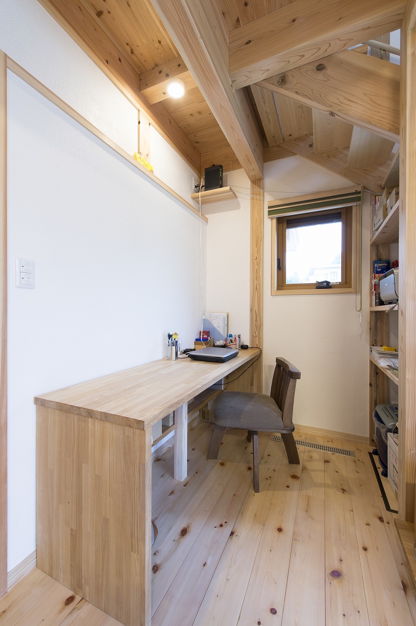 和風の落ち着きのある玄関ポーチから家の中に入ると、杉やヒノキのいい香りに包まれる。「二人ですから、1階も2階も間仕切りのない空間にして、OMソーラーの良さが実感できるようにしたかったんです」とご主人が話す通り、奥に和室が続く1階は、縁側風ウッドデッキまでつながりを持たせた広いLDK。庭に面して窓を大きく取り、吹き抜けとふんだんに使った木の素材の効果で、居るだけで癒されてしまう安らぎ感たっぷりの空間に。ご主人の要望で、床にはヒノキを使い、ワックスもオスモの天然塗料を指定しているのだとか。
