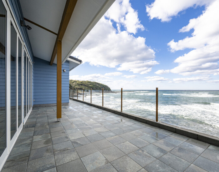 テラスの囲いに透明なアクリル板を採用したことで、視界を遮るものがないのも開放的な所以。木造でありながら、潮風にもびくともしない大きな梁と耐力面材を採用した、しっかりとした構造も大きな安心材料だ。