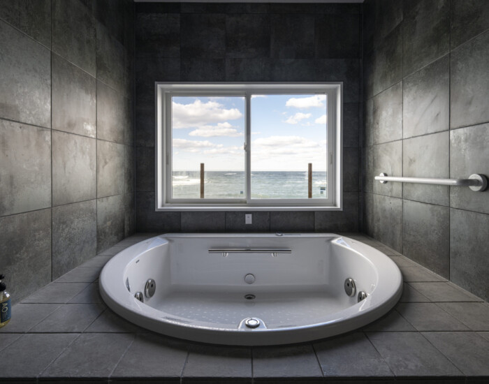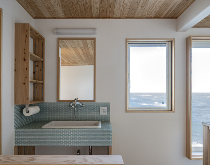 一日の始まりと終わりを豊かにしてくれるのが在来工法で誂えたバスルーム。海を眺めながら湯に浸かる。まるでリゾートスパのようなリラックスしたひととき。