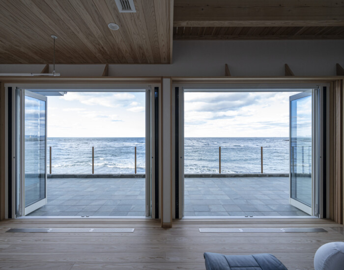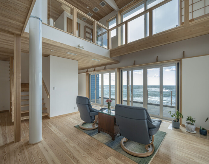 A邸を象徴する1階のLDKは、海に向かって大きく開いているのが特徴。折戸をフルオープンにすると、視界は海へ一直線につながり、まるで船の甲板に立っているような感覚になる。