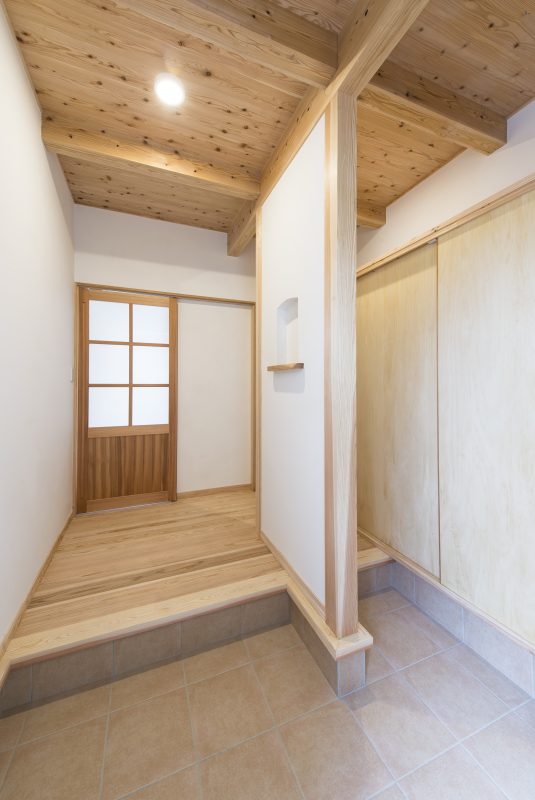 床は杉の無垢材、壁は珪藻土。足を踏み入れた瞬間に自然素材の家ならではの空気の清々しさを実感できる。[サン建築工房]は素材だけでなく、住みやすさへの配慮もお手の物。玄関からはリビング側へと水回り側での2WAYの動線を確保。キッチンのすぐ横には洗面・浴室スペースなので家事動線もコンパクトで便利だ。洗面台も収納もオリジナル造作。既製品ではないので、高さもデザインも好みで仕上げられるので、何度も打合せを重ねてつくりあげた分だけ使い勝手も良くなる。建具も階段もすべて職人が造作しているので素材やテイストに統一感が生まれ、木の家の美しさが際立っている。