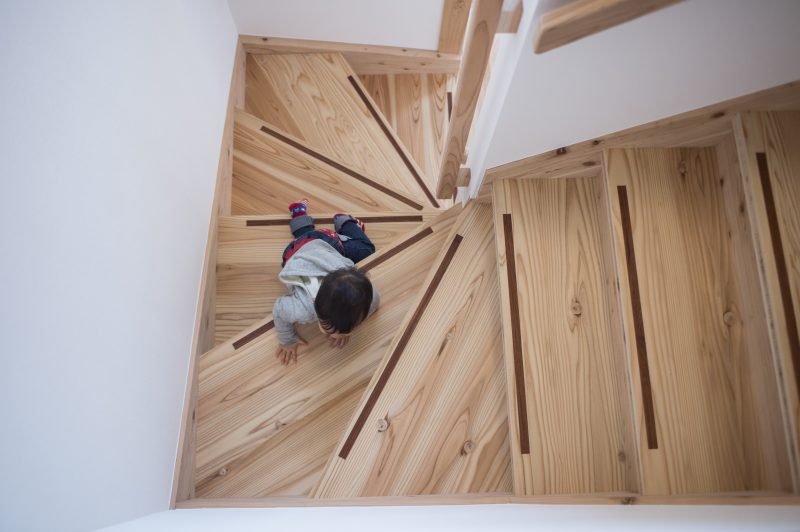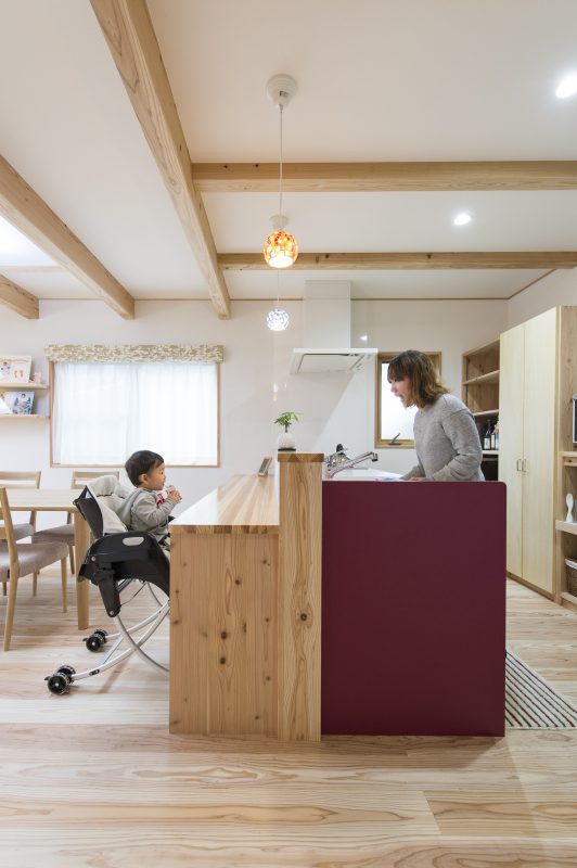 小さい子どもがいるので、1階はキッチンから部屋全体を見渡せる間取りを希望。広いLDKに加えて、地窓と床の間のある本格的な和室もつくった。「目が届く場所で子どもをお昼寝させられるし、歳をとってからはここを寝室にしてもいいと思って和室をつくってもらいました。床の間には節句のお飾りを置くつもりです」。キッチンには大きな蓄熱ヒーターの囲いとパソコンデスクが一体となったカウンターを造作。いずれはここを子ども宿題スペースにしようと考えているとのこと。家族の成長をイメージしながら家づくりを進めたことが伝わってきた。
