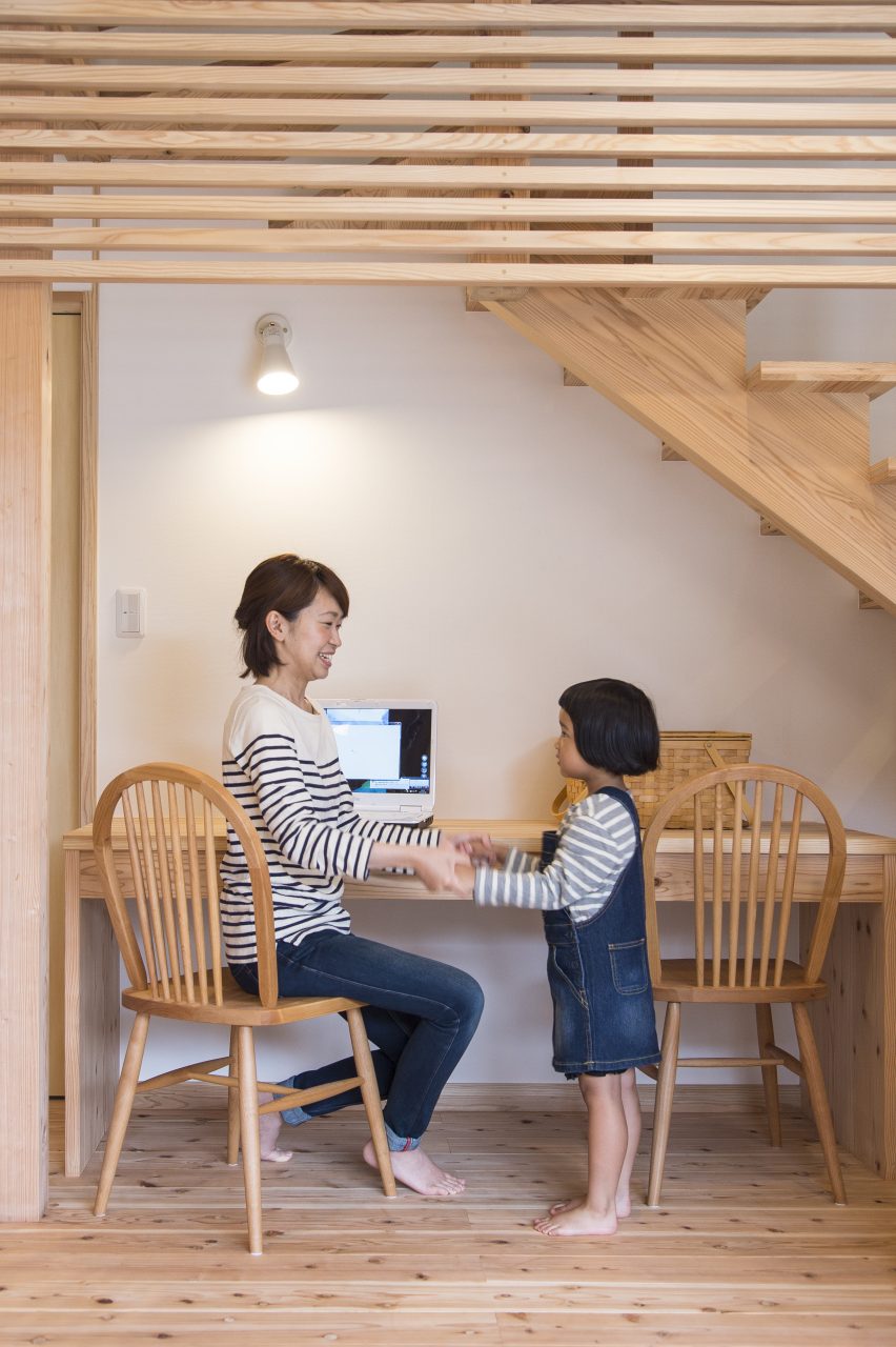 大きな窓を開け放つと、家の外と中の境界線がなくなる。外で感じていた心地いい風が家中を満たし、床にゴロンと大の字になれば、まるで屋外の広場で寝転んでいるような気分だ。Kさんご夫妻が家づくりを考え始めたのは3年ほど前。偶然手にした住宅情報誌を何気なく見ていたおふたりが「いいな」と思う家がサン建築工房が建てた家だった。
