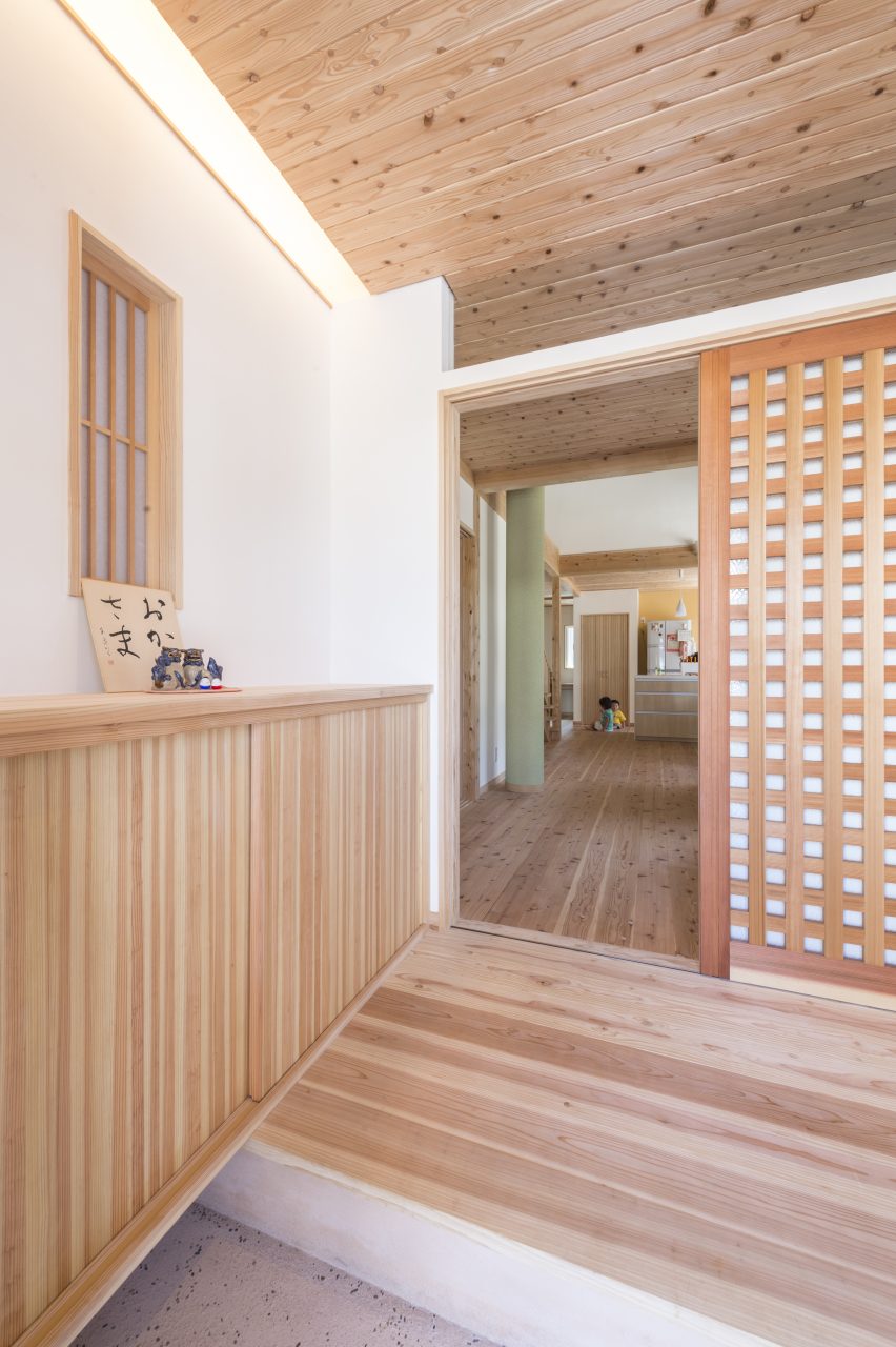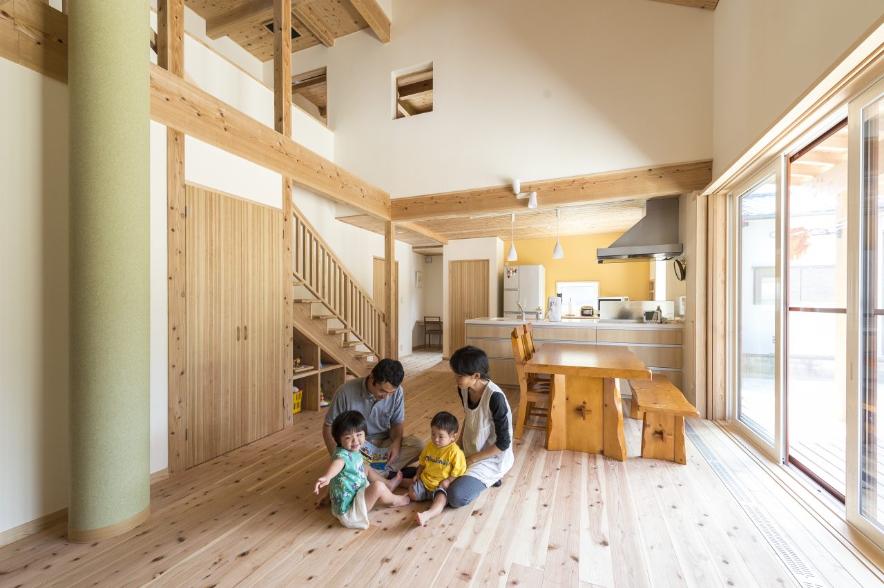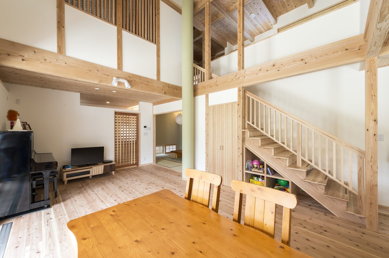 玄関に入った瞬間、木の温かみを感じさせてくれるG家。格子の扉の奥に現れる、ダイナミックな吹き抜けのリビングも圧巻だ。数年に一度の猛暑と言われた夏の日に訪れたにも関わらず、室内は驚くほど空気が澄み、快適そのもの。