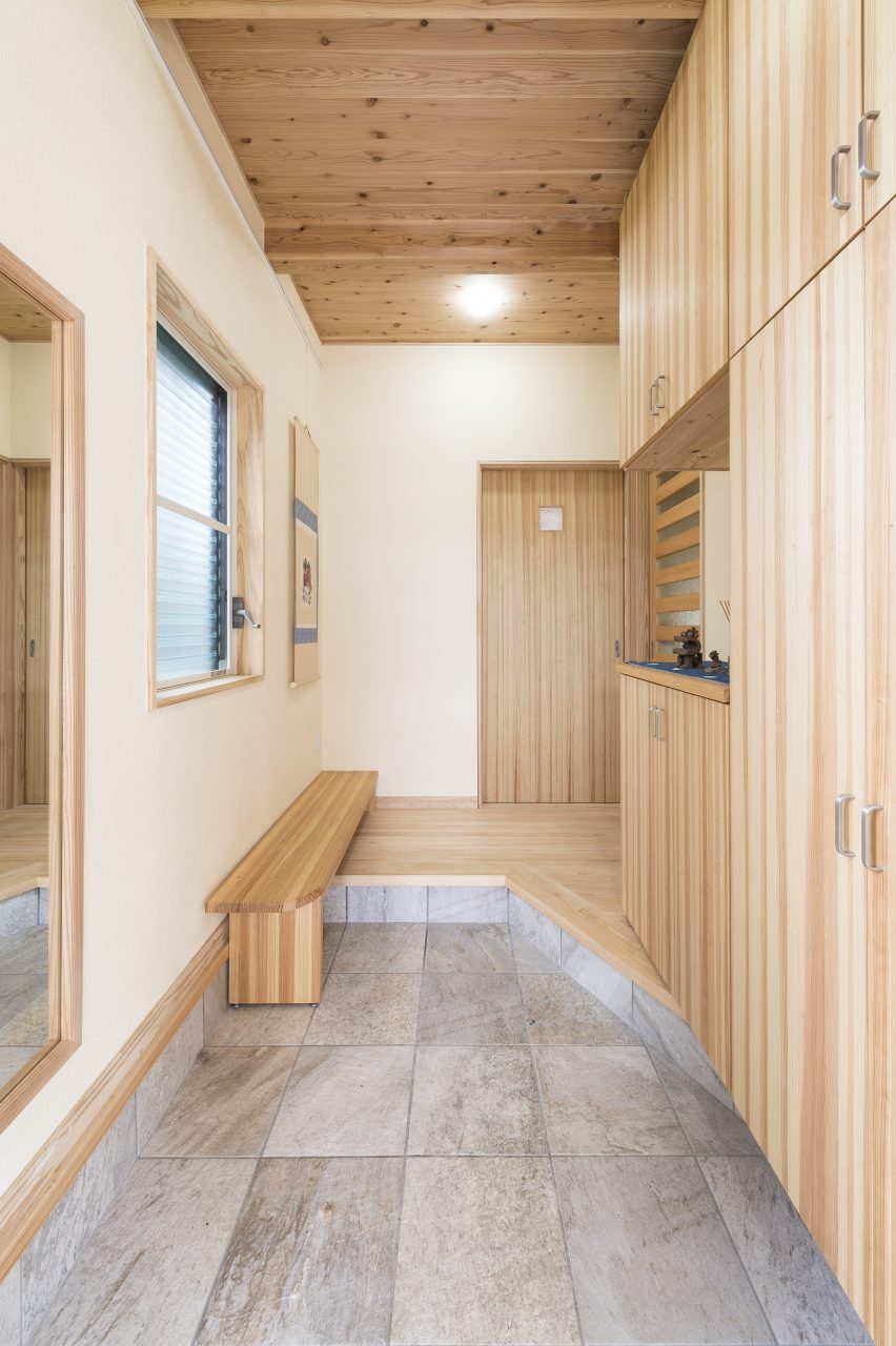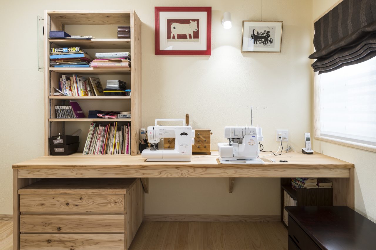 中でも生活スタイルに寄り添った収納の充実ぶりには、設計士や職人の細やかな心配りが感じられる。玄関にオリジナルの大型シューズボックス。リビングには階段下を含め4ヵ所に物入れやデスクを造作。水まわりにも小物棚やクローゼットなど。用途に応じて扉にしたり引き出しをつけたりと、使う人の立場になってデザインされている。
