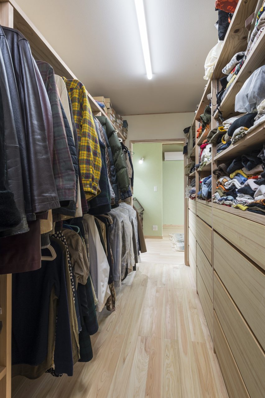 「片付けが苦手なので収納は家のあちらこちらにつくってもらいました。細かいことはサン建築工房さんにお任せでしたが、思いどおりに出来あがりとても快適です」と奥さま。玄関と洋室の両方から出入りできるウォークスルークローゼットもゆとりの広さ。一年中の衣類が収まるので衣替えの必要もなさそうだ。