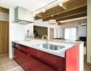 家の中に入った瞬間から天然木のいい香りに包まれるS邸。天井の梁、床材にふんだんに使った杉の木と珪藻土の白壁がゆとりのLDKをさらに広く見せ、落ち着きある雰囲気が心を和ませる。