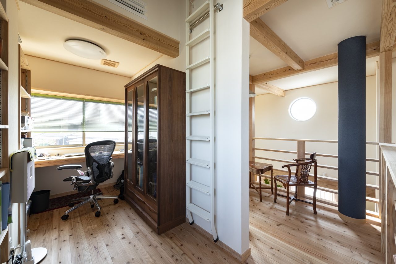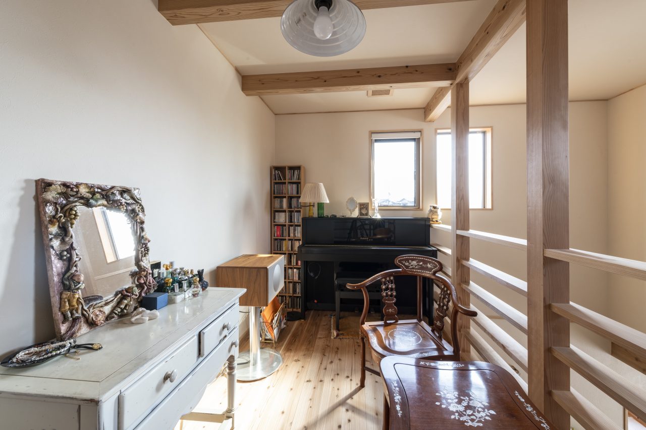 階段を上がると、2階にはご主人の書斎と収納力抜群の納戸があり、フリースペースには奥さまのピアノが置かれている。