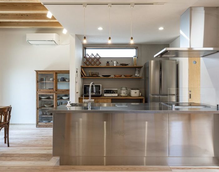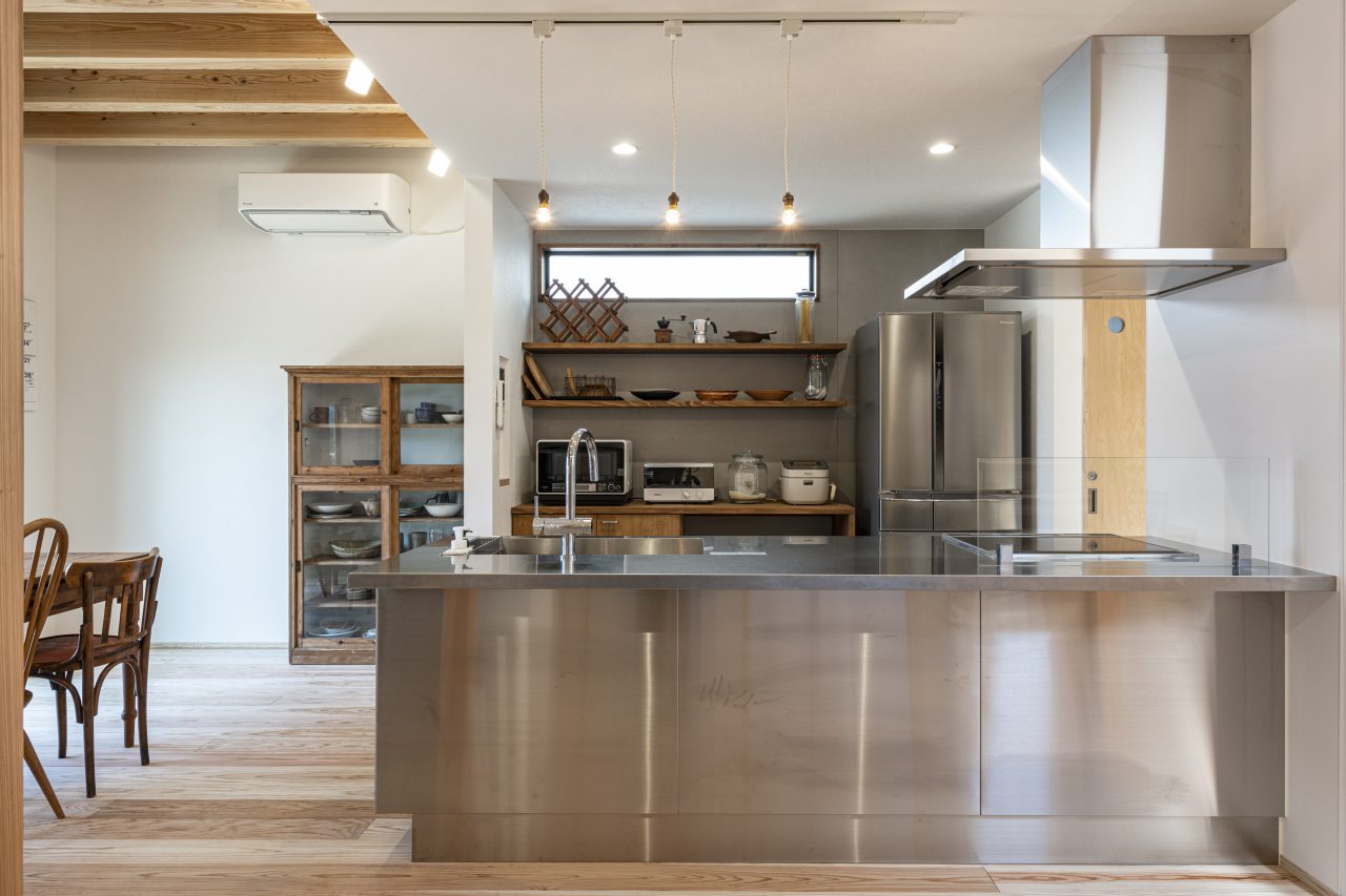 「子どもの頃に、将来自分が住む家のキッチンはオールステンレスがいいと思っていました。それから時が経ち家づくりが現実になってみると、その思いが変わっていないことに気づきました」と奥さまは笑う。「理想のキッチンを探していろいろなメーカーのショールームを見て回りましたね。ようやくこのオールステンレスのキッチンに出会ったときはうれしくて。家の設計はこのキッチンを中心に考え始めました。