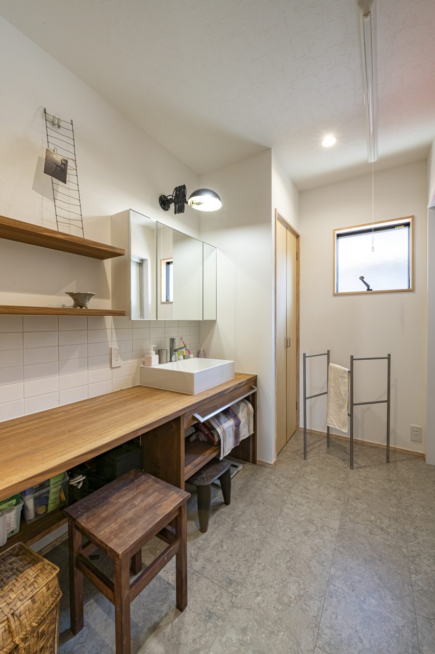 また、共働きの子育て家族にとって、便利な家事動線も重要なポイント。「洗濯物を干したり仕舞ったりできるよう、洗面所はできるだけ広くしてもらいました。キッチンを通ってウッドデッキまで一直線につながっているのでとても使いやすいのも気に入っています」と奥さま。そこにはパントリーやリネン庫など収納スペースも備えられているので、掃除道具などもすぐ取り出せて快適そのもの。