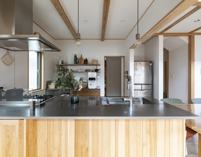 間取りを決める上で役立ったのは、一番大事にしたい場所を起点に考えること。「料理が好きなので、キッチンとダイニングテーブルを横並びにした動線をポイントに、間取りを提案してもらいました」と、奥さまはダイニングを中心に家族が集う暮らしをリクエスト。見た目の美しさだけでなく、作業性が高く、コミュニケーションが取りやすい空間が生まれた。