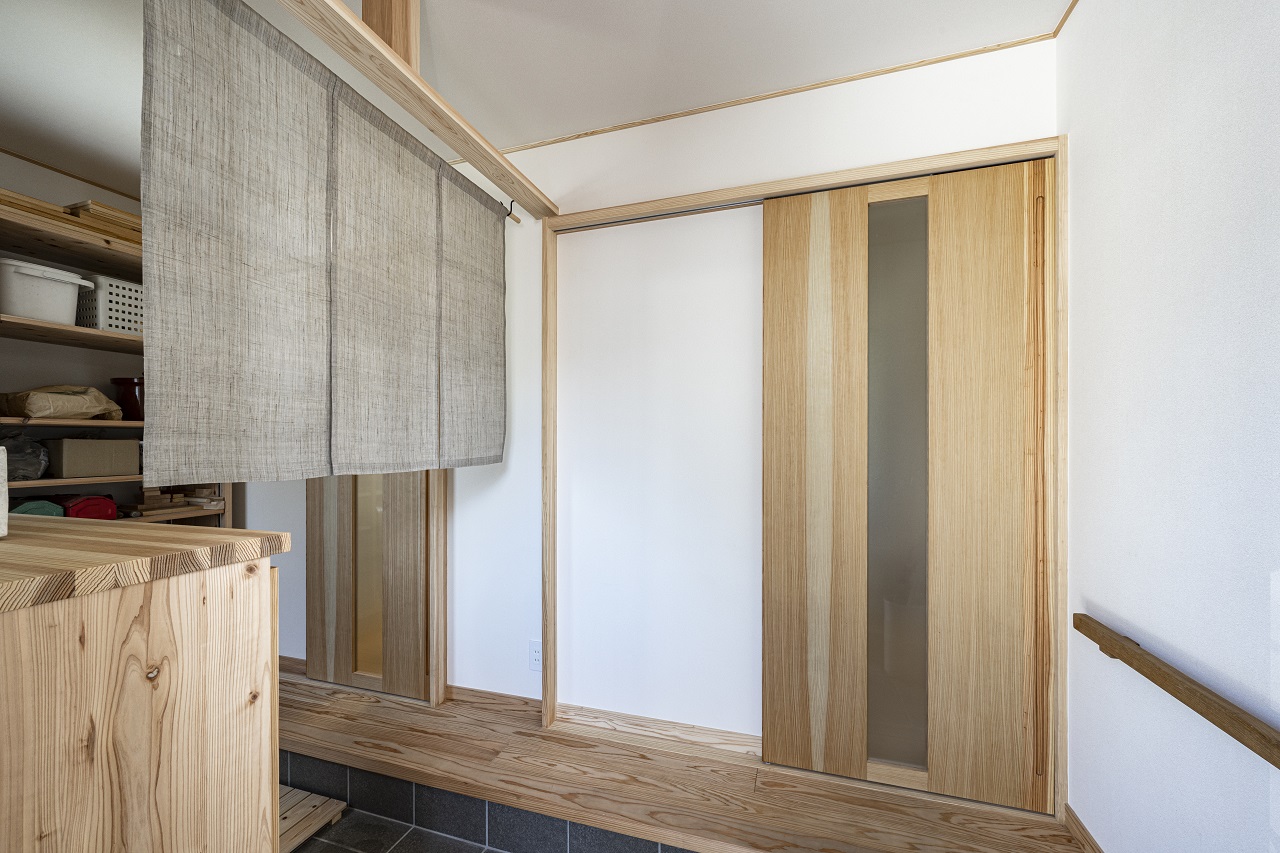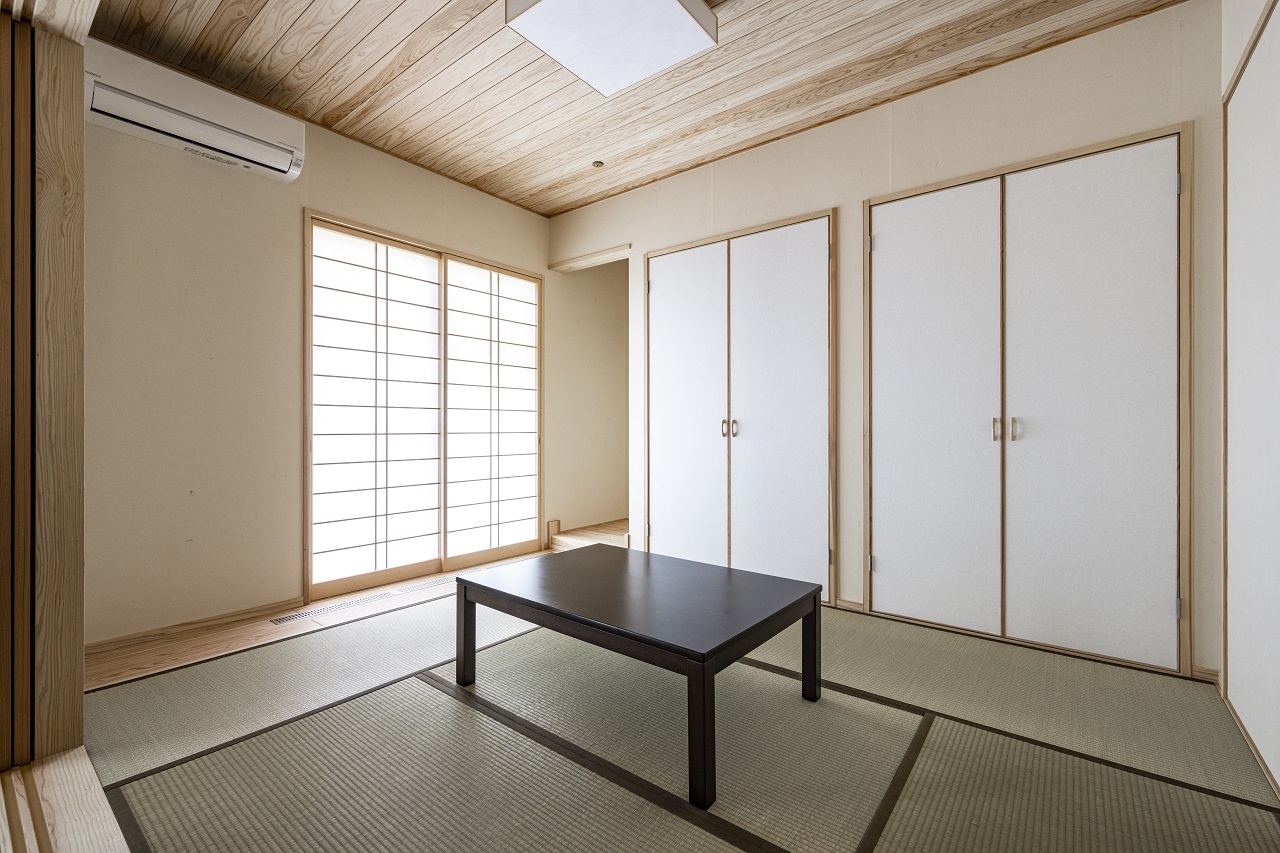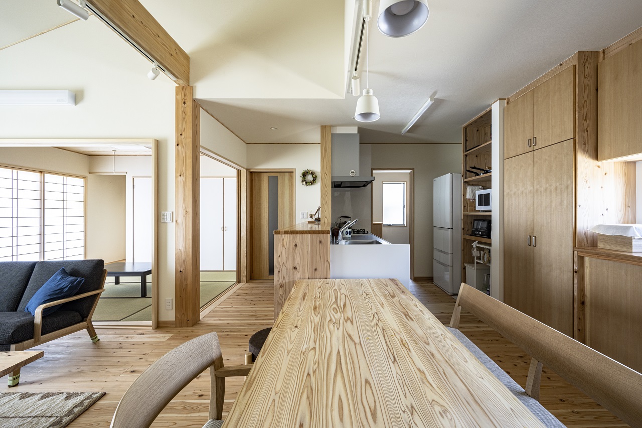 屋内に入ると32坪とは思えないほど広く感じる。OMソーラーにより、部屋を全部仕切る必要がないので、LDKから空間が仕切りなくつながる。全面に節のある小国杉の無垢材をを採用。和室は、天井に無節の杉板を張り、押入れの扉に和紙を施して、特別感を演出した。この和室は引き戸を開けっぱなしにしておけば浩LDK、閉めればゲストルームになるというつくり。無駄な部屋にならないよう、室内物干し用の竿が吊るせる仕掛けも施され、日々、共働き家族の生活を支えている。