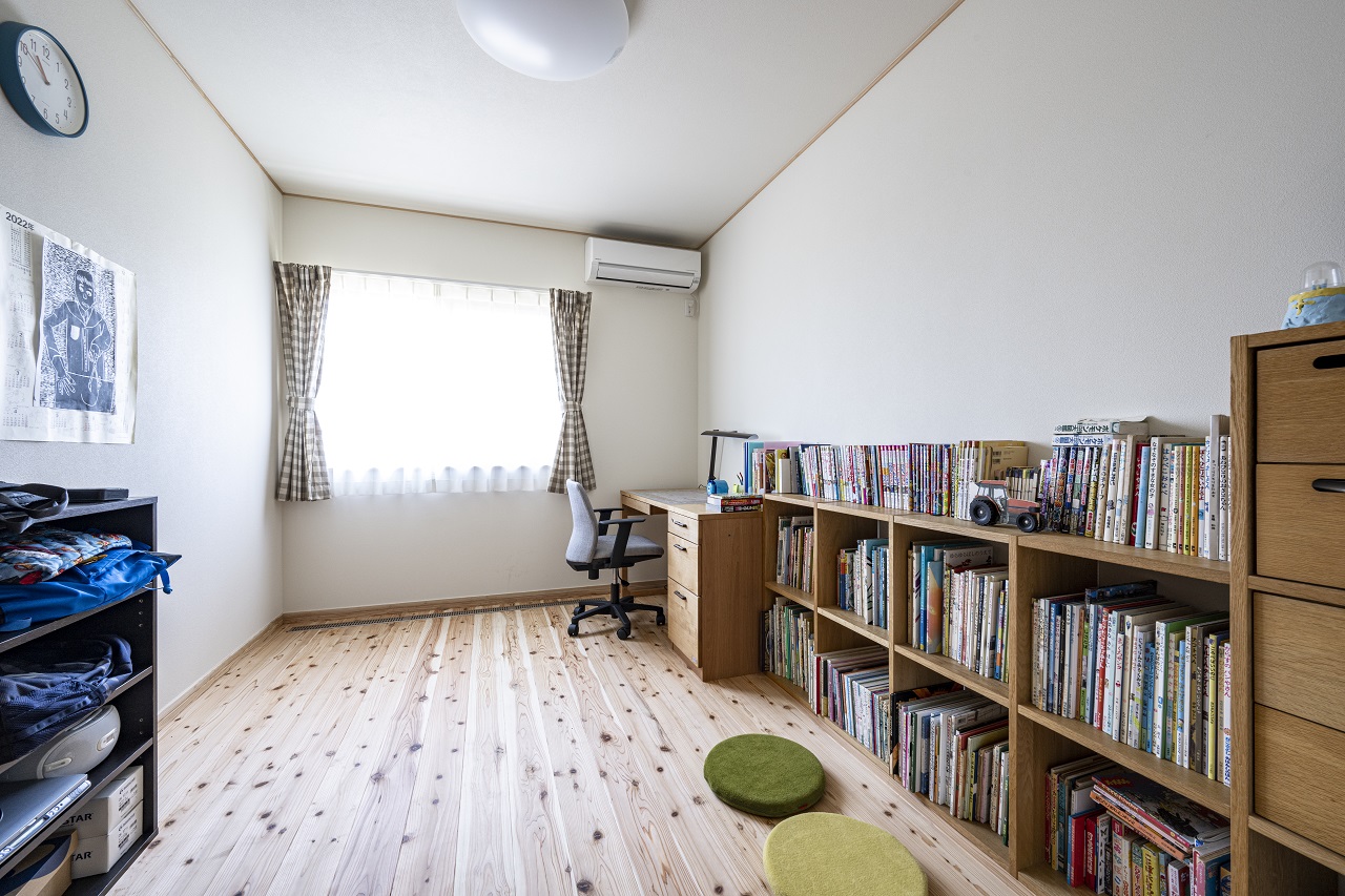 個室は6帖の子ども部屋と寝室、そしてご主人の書斎の3つ。本好きの息子さんの部屋にはたっぷりの本が収納できる本棚が置いてあり置いてあり、肌触りの良い無垢の床に座って読書を楽しむことも増えたそう。奥さまのちょっとした書き物や作業は、キッチン横に造作したデスクで。料理をしながらでも使える動線が秀逸。