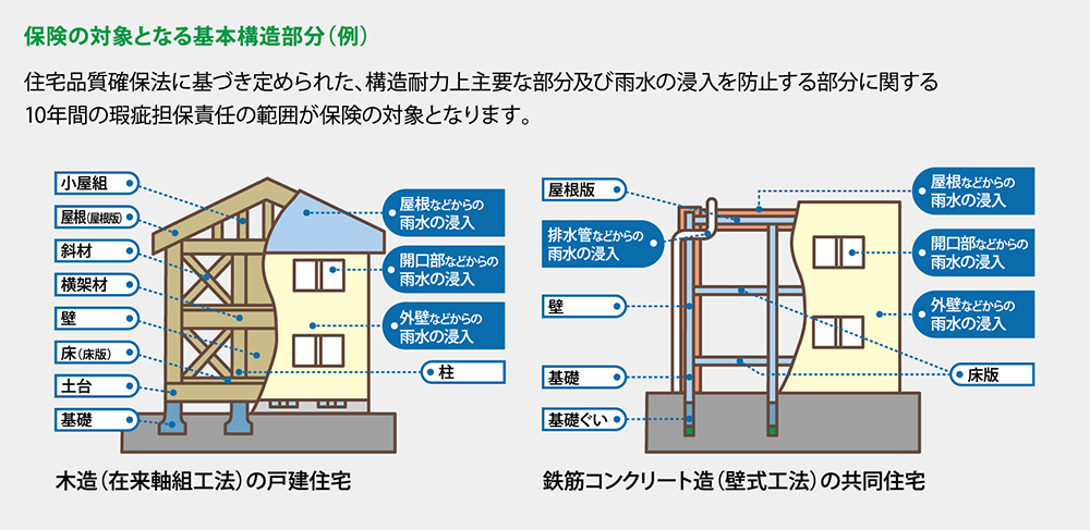 住宅品質確保法に基づき定められた、 構造耐力上主要な部分及び雨水の浸入を防止する部分に関する10年間の瑕疵担保責任の範囲が保険の対象となります。
